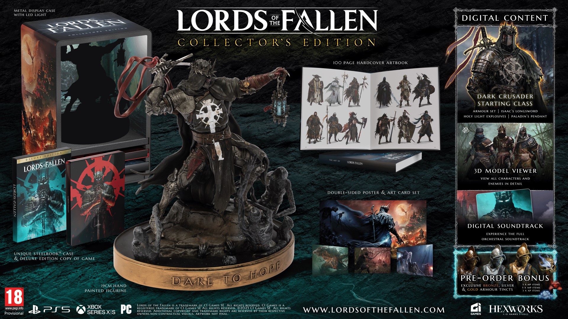 The Lords of the Fallen Edycja Kolekcjonerska to kolekcjonerka gry RPG studia HEXWORKS należącego do spółki notowanej na giełdzie CI Games S.A. dostarczająca graczom wypakowane atrakcjami wydanie z szeregiem dodatkowych atrakcji. Nowa wersja dostarcza fizyczne nagrody, dostępne za największą kwotę.
